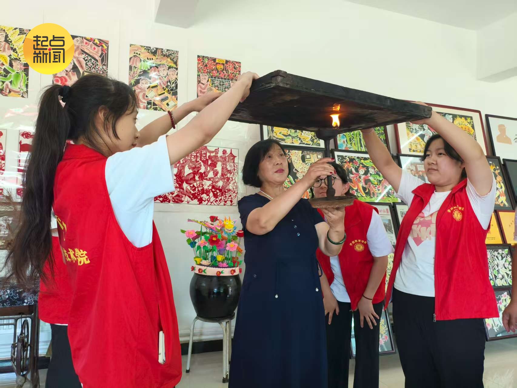 在富县交道镇,团队专访熏画传承人鲁跃芳。其朴素居所内,成员们聆听她数十载守护熏画的赤诚故事。鲁老师不仅详解熏画的历史与艺术,更分享生命与技艺的“不解之缘”。这场对话,让青年学子感受到薪火相传的重量——这既是个人的奋斗史,更是一部浓缩的民间艺术传承史诗。