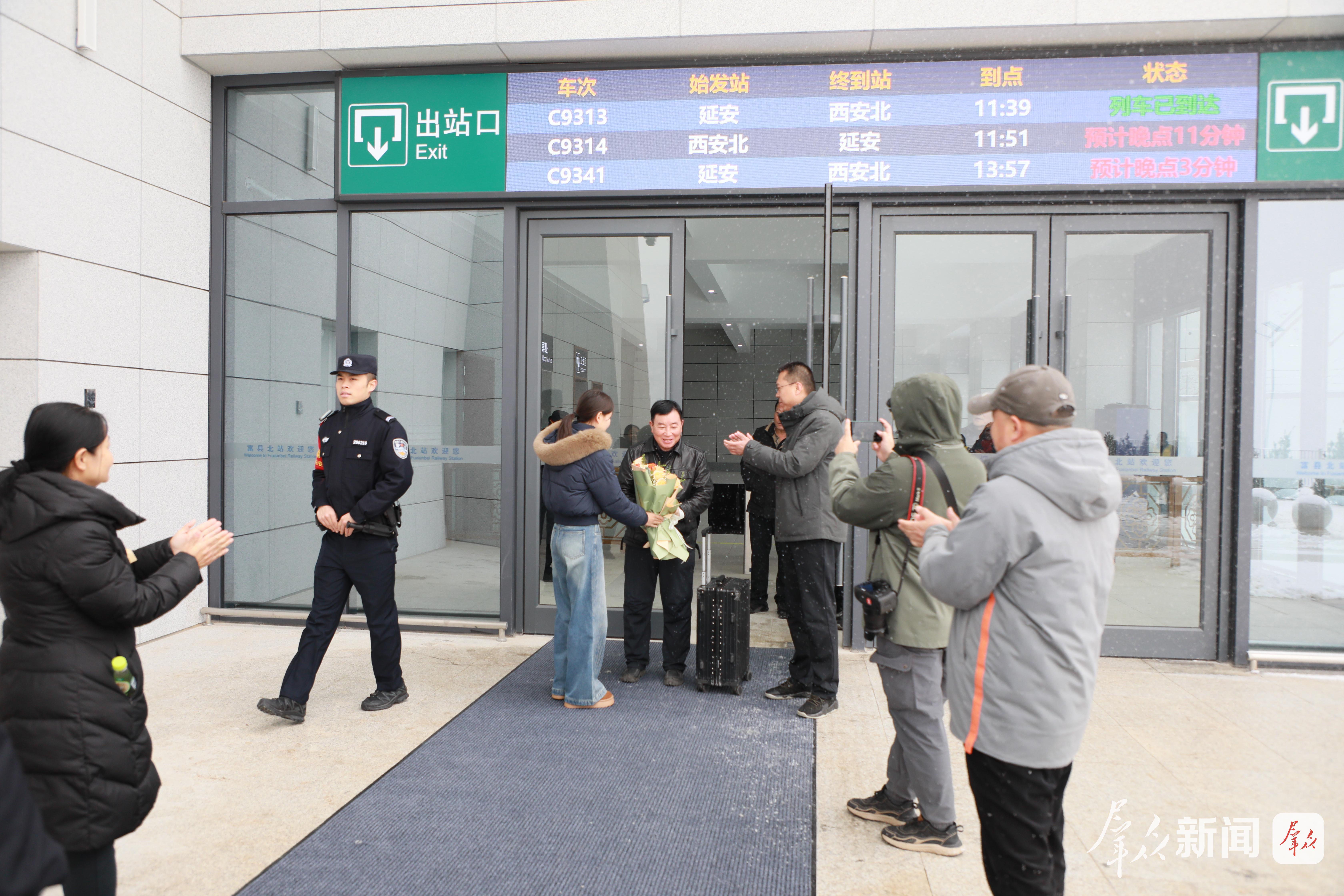 12月31日,富县北站出站口外,众人正在欢迎呼新魁回家。通讯员 吴龙迪摄